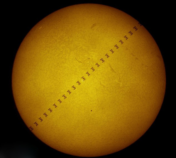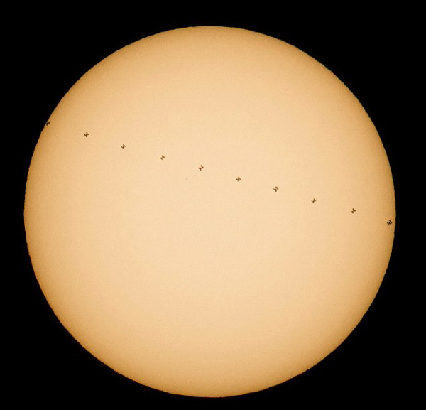 【環(huán)球網(wǎng)綜合報道】據(jù)英國《每日郵報》12月20日報道,美國國家航空航天局(NASA)近日發(fā)布了一張國際空間站經(jīng)過太陽時的合成照片。這張照片由法國業(yè)余攝影師蒂埃里·盧古特(Thierry Legault)于2016年12月17日在美國費城紐伯里公園拍攝,由十幀圖像合成。從照片中可以看到國際空間站繞軌道飛行經(jīng)過太陽時的輪廓和運動軌跡。