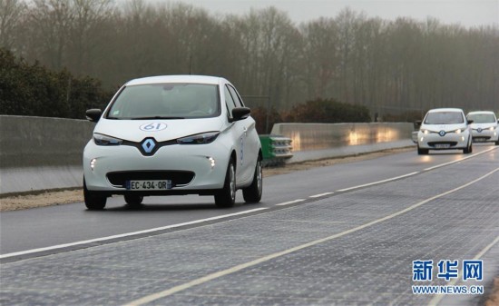 12月22日,汽車行駛在法國西北部圖魯夫爾歐佩爾什鎮(zhèn)的“太陽能公路”上。