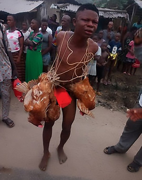 【環(huán)球網(wǎng)綜合報(bào)道】據(jù)英國(guó)《每日郵報(bào)》12月28日?qǐng)?bào)道,近日,在尼日利亞拉各斯州的伊科羅杜(Ikorodu),一名偷雞的男子遭到當(dāng)?shù)厝硕敬?并被扒光衣服,在脖子上掛上三只雞后,強(qiáng)行拉到大街上游行。