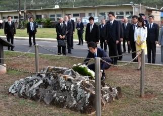 安倍為飯?zhí)锓刻凹o(jì)念碑”獻(xiàn)花。圖片來(lái)自日本外務(wù)省網(wǎng)站