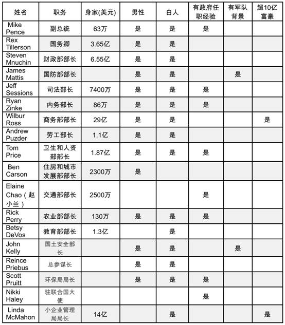 【環(huán)球網(wǎng)報(bào)道 記者 查!繐(jù)美國彭博社1月3日撰文《特朗普的60億內(nèi)閣:男性為主、白人居多、沒有從政經(jīng)驗(yàn)》,稱特朗普按照自己的想法組建了一個(gè)內(nèi)閣。 彭博社稱,作為第一個(gè)億萬富翁美國總統(tǒng),他任命了2位超10億富翁以及多位億萬富翁,這個(gè)內(nèi)閣的凈身價(jià)達(dá)到總計(jì)56億美元;其中兩位進(jìn)入內(nèi)閣或達(dá)到內(nèi)閣部長職位的被任命者是退役將領(lǐng);只有一半人有從政經(jīng)歷。內(nèi)閣成員中的大多數(shù)人與華爾街及美國企業(yè)界有緊密的聯(lián)系。他的內(nèi)閣與其前任相比將有很大的不同。 以下是特朗普內(nèi)閣提名人選:
