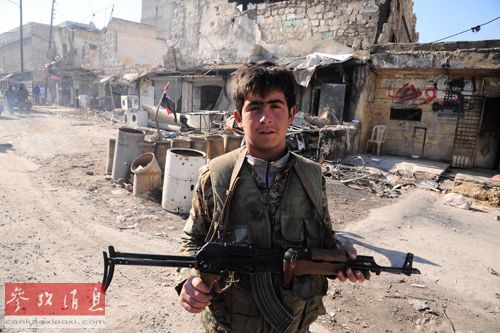 一名敘利亞士兵站在阿勒頗東部的廢棄居民區(qū)前(攝影 阿馬爾)