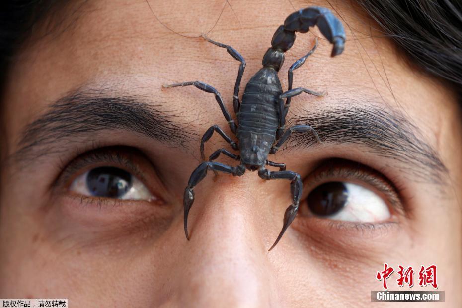 當?shù)貢r間1月17日,沙特利雅得,一名巴勒斯坦男子Nabeel Mussa任由他養(yǎng)的蝎子在自己臉上爬。Nabeel Mussa喜歡養(yǎng)蛇與蝎子,并將它們當作食物吃掉。