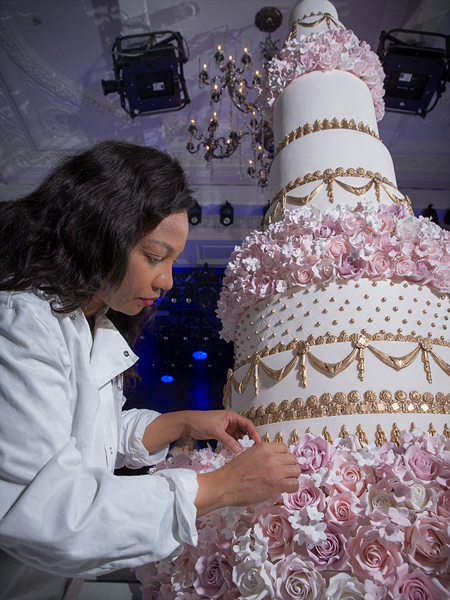 據(jù)悉,蛋糕設(shè)計(jì)師伊麗莎白·蘇拉瑞(Elizabeth Solaru)所使用的定制糖霜是用私人飛機(jī)從世界各地空運(yùn)來的,耗費(fèi)了1000多個(gè)鴨蛋。該蛋糕有香檳草莓、奶油蜜桃、西西里檸檬、紅絲絨和繽紛巧克力等5種口味。此款蛋糕原本有14層,代表婚禮在14日舉行。由于場(chǎng)地空間有限,蛋糕不得已被削減至10層,高達(dá)10英尺(約3米)。