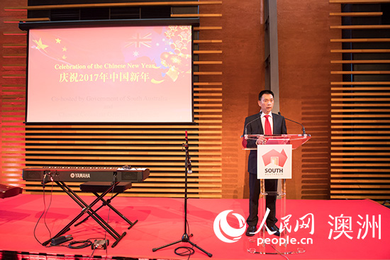 中國駐阿德萊德代總領(lǐng)事梅運才向來賓們致以新春的問候和良好祝福。他在致辭中表示,春節(jié)不僅僅是中國人民的重要傳統(tǒng)節(jié)日,也日益受到澳大利亞人民的喜愛。這是總領(lǐng)館設(shè)立后舉辦的第一次春節(jié)招待會,具有特別意義的是,南澳州政府與總領(lǐng)館聯(lián)合主辦這次活動,體現(xiàn)了南澳州政府重視對華關(guān)系、尊重中華傳統(tǒng)文化以及對總領(lǐng)館工作的大力支持。春節(jié)是闔家團聚的日子,也是回顧展望的日子;厥2016年,中澳關(guān)系取得豐碩成果。中澳自貿(mào)協(xié)定生效一年多來,中澳務(wù)實合作達到前所未有的水平,雙方貿(mào)易額大幅增長,為兩國帶來了互利雙贏,也有力地推動了兩國人文交流與合作。