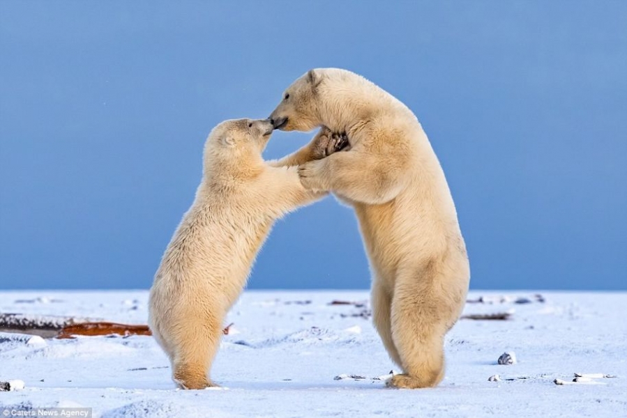 據(jù)英國(guó)《每日郵報(bào)》1月24日?qǐng)?bào)道,近日,攝影師Shayne McGuire捕捉到了兩只小北極熊超有愛(ài)的一幕。這兩只小北極熊在等待母親捕食回來(lái)的時(shí)候,在雪地里手牽手仿佛跳起了華爾茲一樣,甚至還給了對(duì)方一個(gè)溫暖的吻。Shayne表示:“一般情況下是不會(huì)發(fā)生這樣的事情的!