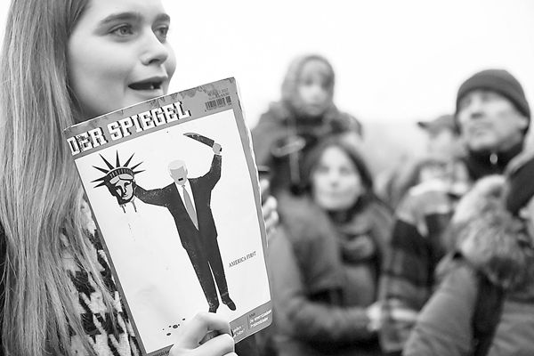 柏林示威者4日持《明鏡》周刊參加反“移民禁令”抗議。