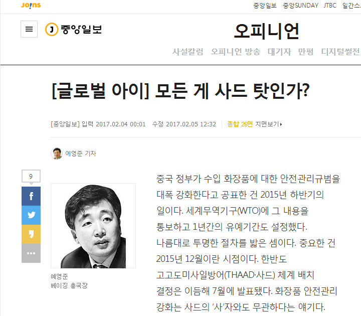 【環(huán)球網(wǎng)綜合報(bào)道 實(shí)習(xí)記者 丁潔蕓】最近,一種“中國近期諸多舉動(dòng)都出于報(bào)復(fù)薩德”的猜疑在韓國輿論場(chǎng)上傳播,中國強(qiáng)化化妝品安全管理?xiàng)l例、43批韓國產(chǎn)坐便器在華上黑榜、韓居民因照片未達(dá)標(biāo)準(zhǔn)被中國拒簽、韓星在中國電視上“消失”等事件都被韓媒解讀為中國對(duì)“薩德”的報(bào)復(fù)。在這種輿論環(huán)境下,韓國《中央日?qǐng)?bào)》駐北京總局長芮榮俊2月4日發(fā)表了題為“所有事情均咎于‘薩德’?”的文章,提醒韓國不要過度猜忌,F(xiàn)將此文摘編如下: