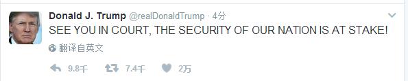 【環(huán)球網(wǎng)網(wǎng)快訊 記者 趙衍龍】美聯(lián)社2月9日消息,美國(guó)上訴法院宣布將維持對(duì)特朗普旅行禁令的暫停判決。特朗普隨后在推特上迅速作出回應(yīng):“法院見(jiàn)!我們國(guó)家的安全正處于危險(xiǎn)之中!”