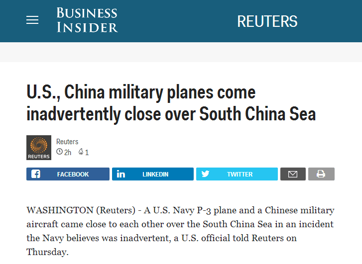 這位匿名的美國官員說,這兩架飛機在黃巖島附近的上空相遇,當時雙方之間距離不足1000英尺(約合305米)。