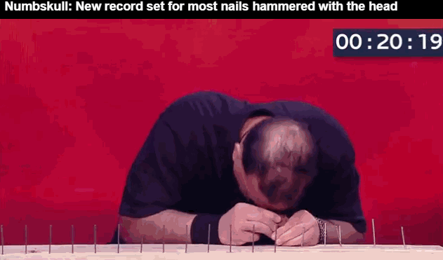 據(jù)英國《每日郵報》2月13日報道,近日,美國男子John Herrero創(chuàng)造一項世界紀錄。John在創(chuàng)造這項紀錄的過程中使用了一個特殊的工具——他的顱骨。據(jù)悉,John被稱為“鐵頭”,在最近的這場挑戰(zhàn)中他在兩分鐘內(nèi),用顱骨將38顆釘子錘入木板中。但其實這并不是他所創(chuàng)造的第一項吉尼斯世界紀錄,他同時也是1分鐘內(nèi)錘入釘子最多的人。編譯/熊婉君(參考消息網(wǎng)獨家編譯,轉(zhuǎn)載請注明出處)