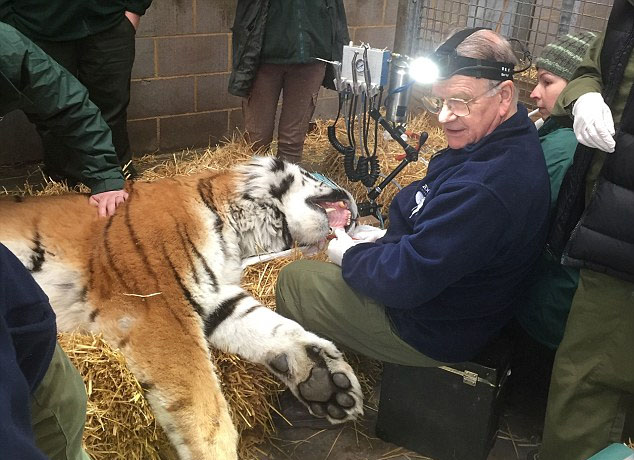 據(jù)英國(guó)《每日郵報(bào)》2月13日?qǐng)?bào)道,近日,英國(guó)牙醫(yī)彼得·凱爾泰斯(Peter Kertesz)為住在英格蘭貝德福德郡沃本野生動(dòng)物園的老虎埃爾頓(Elton)醫(yī)治受感染的開裂犬齒。據(jù)悉,該老虎為嚴(yán)重瀕危的東北虎,受感染的牙齒若不及時(shí)治療將致死。