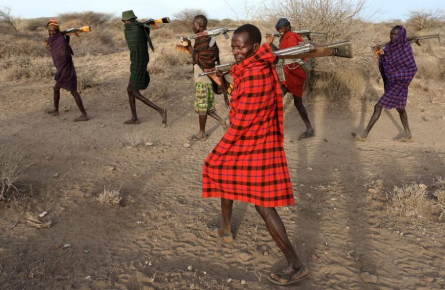 據(jù)路透社2月14日?qǐng)?bào)道,肯尼亞10日宣布,持續(xù)干旱已釀成“國家災(zāi)難”。肯尼亞總統(tǒng)肯雅塔發(fā)表聲明,呼吁國際伙伴伸出援手,幫助肯尼亞度過這場(chǎng)嚴(yán)重的旱災(zāi)。在肯尼亞旱災(zāi)肆虐的北部,全副武裝的“牛仔”闖進(jìn)農(nóng)場(chǎng)和野生動(dòng)物保護(hù)區(qū)為牲畜爭(zhēng)奪水源,導(dǎo)致暴力沖突頻發(fā),造成至少11人死亡,一家賓館被燒毀。圖為Turkana部落男性牧民扛槍巡視牧區(qū),嚴(yán)防敵對(duì)部落“入侵”。編譯劉揚(yáng)子(參考消息獨(dú)家編譯,轉(zhuǎn)載請(qǐng)注明出處)
