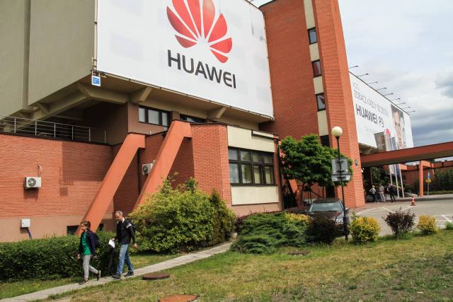 2016年6月14日,在波蘭首都華沙街頭,人們從中國華為公司的巨幅標志前走過。(新華社記者陳序攝)