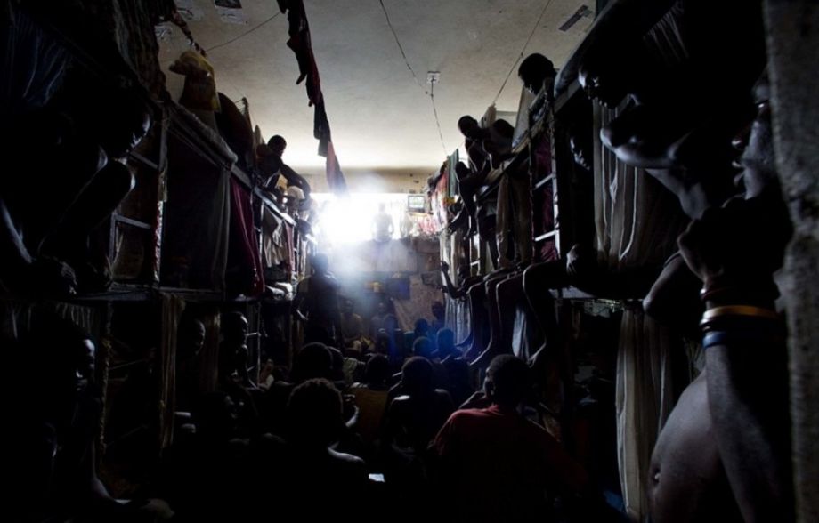 據(jù)英國(guó)《每日郵報(bào)》報(bào)道,近日,一組關(guān)于海地國(guó)家監(jiān)獄的照片曝光,囚犯?jìng)冊(cè)趽頂D臟亂的國(guó)家監(jiān)獄里生活,忍受著營(yíng)養(yǎng)不良和傳染病的折磨,惡劣的環(huán)境已經(jīng)導(dǎo)致海地監(jiān)獄里的囚犯死亡人數(shù)急劇上升,僅上個(gè)月就有21名囚犯死亡。圖為囚犯?jìng)償D在陰暗狹小的牢房里看電視。電視是囚犯?jìng)冏约簻愬X(qián)買(mǎi)來(lái)的。