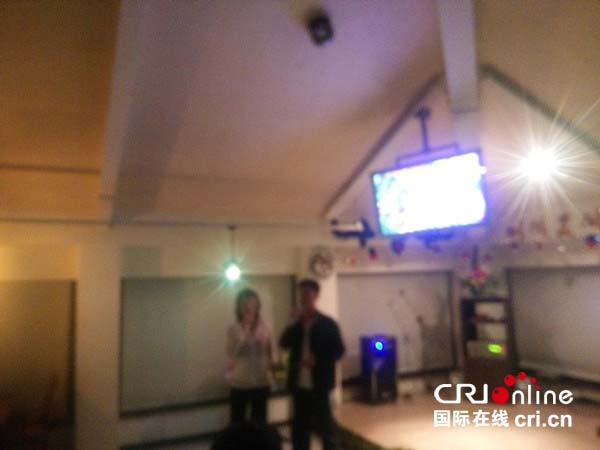 在金剛山旅游時,當(dāng)?shù)氐牟蛷d里師生聚餐,屏幕對面是餐桌