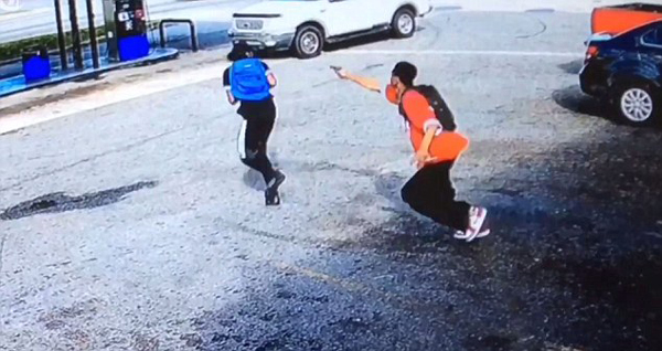 雜貨店門口的攝像顯示,托馬斯和馬諾發(fā)生了爭執(zhí),馬諾背著藍色的背包,一只手里還拿著一把槍。2個人爭執(zhí)了幾分鐘后,馬諾便把槍別在皮帶上,幾秒種后,穿著紅色T恤的托馬斯瞅準時機迅速將槍拔了出來,并朝著馬諾開火。