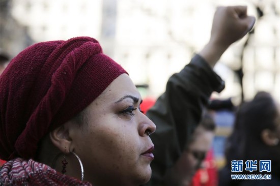 3月8日,在美國紐約曼哈頓舉行的“沒有女性的一天”婦女節(jié)集會上,一名參與者在聽演講時落淚。