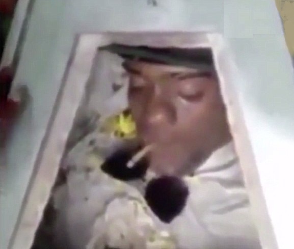 視頻中,一名年輕男子躺在棺材內(nèi),可看到其安詳?shù)拿嫒莺头旁陬^部旁邊的鮮花,其胸前還放了一副墨鏡。在拉丁哀樂(lè)中,一名年長(zhǎng)的男子走近死者,將點(diǎn)燃的香煙放到他的口中,有些傷感地說(shuō)道:“嘗嘗看,這是你平時(shí)喜歡的煙!