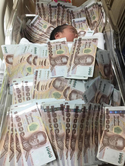 現(xiàn)在炫富的方式真是無力吐槽,泰國一個(gè)剛剛出生的孩子,他的土豪阿姨就送來了200萬泰銖(約40萬元人民幣)現(xiàn)金作為出生禮物。并且把這些1000泰銖(約200元人民幣)面值的紙幣當(dāng)被子蓋在嬰兒身上。嬰兒蓋40萬現(xiàn)金睡,嘖嘖~這土豪花樣炫富雖然富貴氣十足,但卻遭來了無數(shù)網(wǎng)友的一片吐槽聲:“你有錢也不用這么曬吧,有沒有考慮過小孩的感受。”