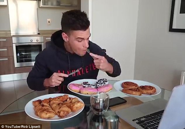 據(jù)英國《每日郵報》3月16日報道,近日,在一則瘋傳網(wǎng)絡的視頻中,一名穿著黑色衛(wèi)衣的男子正向網(wǎng)友們說明他面前3大盤食物的熱量含量。8點19分,該男子開始吞食面前的美味。他花了5分鐘“消滅”了5個甜甜圈,又花了9分鐘吃光了2大盤滿滿的面包,期間還喝了2大杯牛奶。下午1點54分,該男子又拿出一塊奧利奧芝士蛋糕,并在上面澆了一層融化了的巧克力。