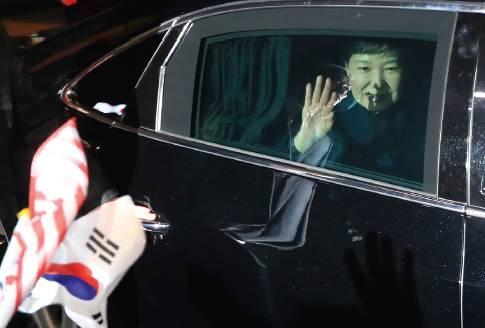 3月12日,樸槿惠乘車抵達位于韓國首爾三成洞的私邸并向支持者揮手。當晚,遭彈劾并被解除總統(tǒng)職務的樸槿惠搬出韓國總統(tǒng)府青瓦臺,回到她的私宅。
