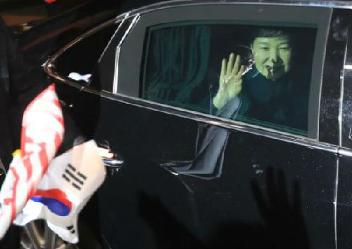 3月12日,樸槿惠乘車抵達(dá)位于韓國(guó)首爾三成洞的私邸并向支持者揮手。(新華社/法新社)