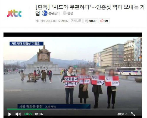 據(jù)韓國(guó)JTBC電視臺(tái)報(bào)道,一家韓國(guó)化妝品企業(yè)近日自覺選擇“站隊(duì)”,其員工在首爾市區(qū)公開舉行示威活動(dòng),他們舉著用中英韓文寫的“反對(duì)薩德”的標(biāo)語(yǔ),以表明自己對(duì)于現(xiàn)政府部署“薩德”的反感。