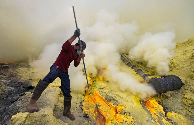 在伊真火山工作的礦工門,由于他們每天需在礦井深處工作,所面臨的環(huán)境非常惡劣,所以平均壽命很短。這些勇敢的工人每天需在鋒利的巖石面上攀爬,還得從2800米高的活火山的一側(cè)下山,而伊真火山可能隨時(shí)會(huì)爆發(fā)。硫磺礦工人們每天冒著生命危險(xiǎn)工作,收入?yún)s十分微薄——平均每日3英鎊(約合人民幣25.62元),工作12小時(shí)后輪班,工作內(nèi)容為分解固化的硫,然后將其運(yùn)出火山口底部。