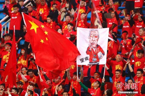 上周,國(guó)足在主場(chǎng)戰(zhàn)勝韓國(guó)隊(duì),現(xiàn)場(chǎng)觀(guān)眾擎起中國(guó)隊(duì)主教練里皮的漫畫(huà)像。 中新社記者 富田 攝