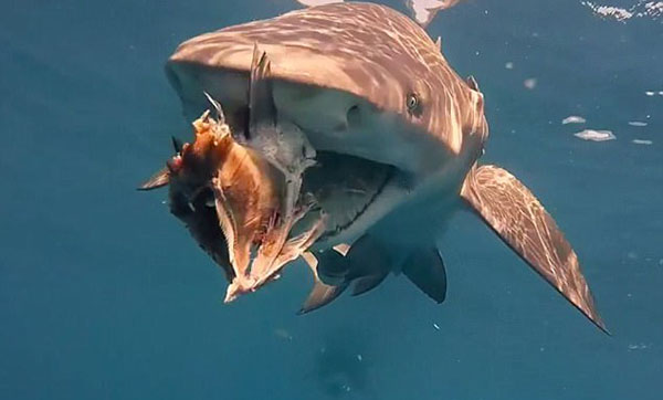 從拍攝到的視頻可以看見(jiàn),博韋把食物投向一群檸檬鯊和絲鯊。鯊魚(yú)看見(jiàn)食物后朝他游來(lái),幾乎與他擦肩而過(guò),距離之近讓人不禁毛骨悚然。其中有一個(gè)鏡頭還近距離地拍到了絲鯊躍出水面接住食物的一幕。幸運(yùn)的是,他并沒(méi)有受到任何傷害。在拍攝期間,作為一名自由潛水員,他沒(méi)有佩戴呼吸器。