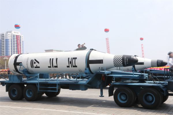這是4月15日在朝鮮首都平壤舉行的閱兵式上拍攝的“北極星—2”型潛射中程彈道導(dǎo)彈。 新華社記者朱龍川攝