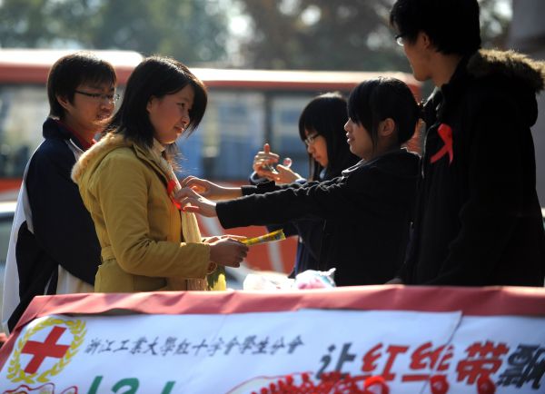 資料圖:2008年12月1日世界艾滋病日,浙江工業(yè)大學(xué)的志愿者們?yōu)橥瑢W(xué)帶上“紅絲帶”。新華社記者徐昱攝