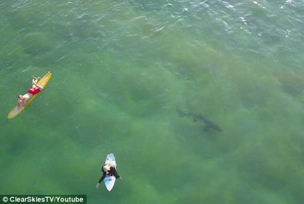 大衛(wèi)拍下了這驚險的一幕,并將視頻傳到了YouTube上。在視頻中,他發(fā)現(xiàn)鯊魚后和一旁的伙伴說道:“天哪!那里有一頭鯊魚。它就在那幾名沖浪者下面!苯又,他操控?zé)o人機(jī)漸漸下降,試圖提醒沖浪者們鯊魚就在旁邊。與此同時,鯊魚似乎受到了驚嚇,自行游走了。