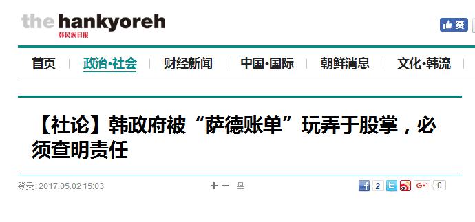 【環(huán)球網(wǎng)綜合報(bào)道】日前,美韓圍繞著部署“薩德”的費(fèi)用互相指責(zé),令世界“大跌眼鏡”。對(duì)此,韓國《韓民族日?qǐng)?bào)》5月2日發(fā)表題為“韓政府被‘薩德賬單’玩弄于股掌,必須查明責(zé)任”的社論稱,韓國在挨了美國背后一擊后,依然被美國牽著鼻子,未能作出妥善反應(yīng),只能苦苦掙扎...韓國政府竟然淪落到如此令人恥笑的地步,使人不禁感到憤慨!凹热皇虑橐呀(jīng)發(fā)展至此,韓國就應(yīng)該展開國政調(diào)查,查明薩德部署過程的詳細(xì)始末,切實(shí)追究責(zé)任”。