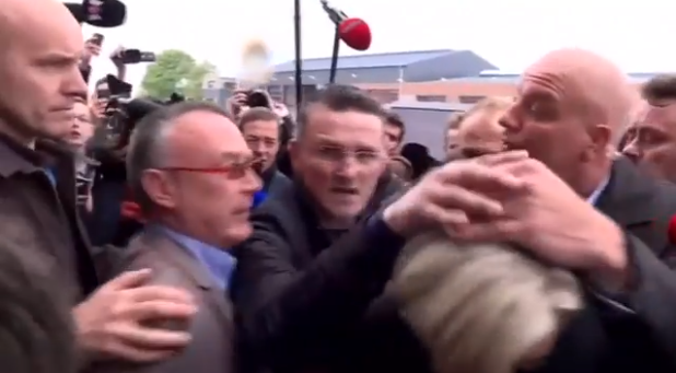 勒龐的私人保鏢當(dāng)時(shí)用手掌擋住她的頭,使其沒有被投擲來的雞蛋砸到。