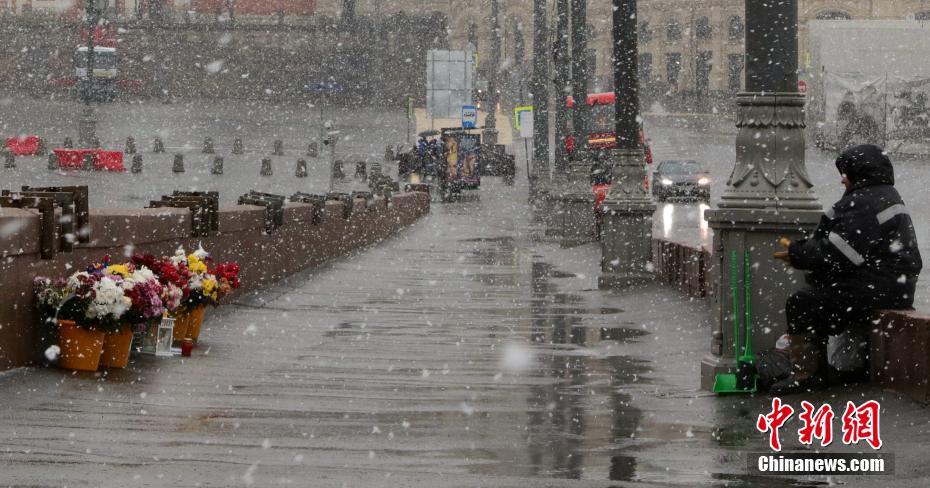 5月8日,一名清潔工在打掃完俄反對(duì)派領(lǐng)袖涅姆佐夫遇刺地附近的衛(wèi)生后坐在路邊休息。盡管已經(jīng)進(jìn)入5月,但當(dāng)天莫斯科市中心還是迎來一場(chǎng)大雪。中新社記者 王修君 攝