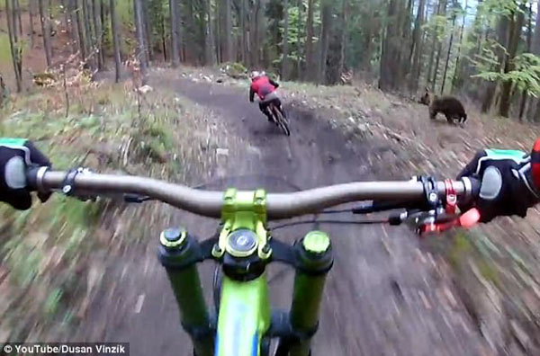 這一驚險(xiǎn)時(shí)刻由另一位山地車騎手頭盔上的攝像機(jī)記錄了下來。從視頻中可以發(fā)現(xiàn),這只大黑熊在轉(zhuǎn)身走向樹林中后,再次出現(xiàn)了,它正對著杜桑大吼。