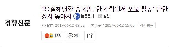 韓國《京鄉(xiāng)新聞》報道稱,被IS殺害的中國人被證實通過韓國人開設的學校進行傳教活動,中國網(wǎng)絡上反韓情緒再度高漲。