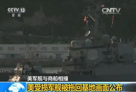 原標(biāo)題:美軍艦與商船相撞:美受損軍艦被拖回基地畫面公布