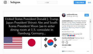 【環(huán)球網(wǎng)報(bào)道 記者 查希】在德國(guó)漢堡出席G20峰會(huì)的美日韓三國(guó)首腦6號(hào)舉行會(huì)談。為此,美國(guó)總統(tǒng)特朗普特意在主流社交媒體上發(fā)布了相關(guān)信息。他在官方推特稱(chēng)“和日本總統(tǒng)安倍晉三、韓國(guó)總統(tǒng)文在寅的三邊會(huì)談及晚餐很棒!