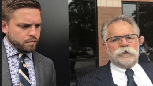 律師湯姆·布魯諾(右)8日表示,他努力為委托人辯護(hù),但不具備改變事實的魔法,左為另一位擔(dān)任克利斯汀森辯護(hù)律師艾文斯,他是湯姆的兒子。(美國《世界日報》/黃惠玲 攝)