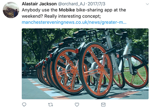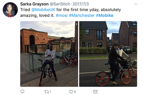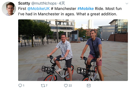 推特網(wǎng)友@muttNchops發(fā)文說道,“第一次在曼徹斯特騎摩拜,是這么多年來我在曼徹斯特玩得最開心的一次。(共享單車進駐)真是錦上添花!