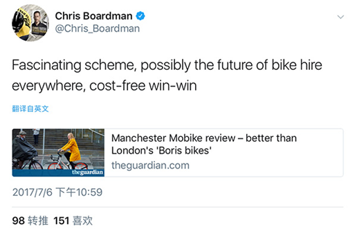 推特網(wǎng)友@Chris_Boardman則認為,(共享單車是)極好的方案,可能未來共享單車會隨處可見,這是零成本的雙贏。