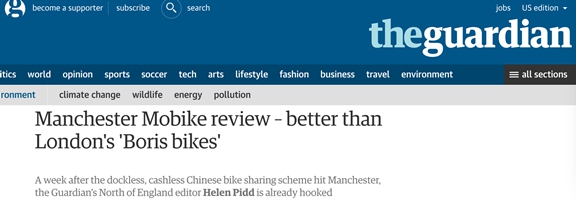 英國《衛(wèi)報》編輯海倫·皮德也被中國共享單車“圈粉”,并撰寫了題為《評曼徹斯特摩拜單車——強于倫敦“鮑里斯單車”》的文章。她認為共享單車有隨停隨取、使用成本低廉、有騎行樂趣、鼓勵良好行為以及不耗費公共資金五大優(yōu)點,比已經(jīng)在倫敦運營數(shù)年的鮑里斯單車(由英國現(xiàn)任外交大臣,時任倫敦市長鮑里斯·約翰遜發(fā)起設(shè)立)要親民、便捷、好用得多。