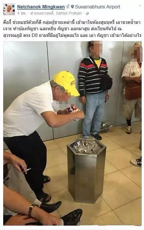 近日,一則“中國(guó)游客在泰國(guó)國(guó)際機(jī)場(chǎng)內(nèi)吸食大麻,安保人員放任不管”的消息在泰國(guó)臉書上引發(fā)網(wǎng)友熱烈討論,發(fā)帖人Netchanok Mingkwan女士稱,她在泰國(guó)曼谷素萬那普國(guó)際機(jī)場(chǎng)D8候機(jī)區(qū)域的吸煙室,看到一個(gè)中國(guó)旅游團(tuán)的大爺,把大麻放在一個(gè)經(jīng)過改裝,戳有氣孔的塑料瓶子上點(diǎn)燃并吸食,搞得里面烏煙瘴氣,她質(zhì)疑中國(guó)游客如何將大麻帶入泰國(guó)境內(nèi)。