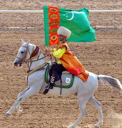 汗血寶馬是土庫曼斯坦的民族驕傲和國家象征。土庫曼是馬背上的游牧民族,古代土庫曼人生活、征戰(zhàn)都離不開馬,汗血寶馬是可靠的助手和忠誠的朋友,“在草原上不因風吹而掉隊,不背叛、不欺瞞”。土庫曼人愛馬,視馬為平等的家庭成員。不打馬,不給馬上籠頭,為馬量身打造貴重的首飾,制作精美的馬衣。像迎接小孩子誕生一樣慶祝小馬駒的出生,給馬起人的名字,民間有“每天早上看望父親后就看望馬兒”的諺語。土庫曼斯坦國徽正中間就是一匹金色汗血寶馬,土是世界上唯一一個將馬形象置于國徽中的國家。土庫曼斯坦斥巨資在全國5個州及首都阿什哈巴德市建設賽馬綜合體,將每年4月的最后一個周日定為賽馬節(jié),舉行賽馬、馬匹選美比賽、馬術表演等系列慶;顒印8鞯匾院寡獙汃R為主題的雕塑、噴泉等建筑隨處可見。為舉辦2017年第五屆亞洲室內與武道運動會興建的阿什哈巴德奧運村主體育館上,便矗立著威風凜凜的馬頭藝術雕塑,會徽上也融入了汗血寶馬形象。為保護汗血寶馬、發(fā)展馬業(yè),土庫曼斯坦總統(tǒng)別爾德穆哈梅多夫于2010年倡議成立阿哈爾捷金馬協(xié)會,并親自掛帥,擔任協(xié)會主席。別爾德穆哈梅多夫總統(tǒng)還著有《阿哈爾捷金馬—我們的驕傲和榮耀》一書,講述汗血寶馬的發(fā)展歷程。