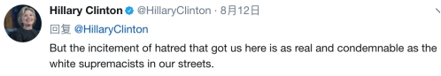 不只奧巴馬,美國前國務(wù)卿希拉里也發(fā)表推文說:“煽動種族仇恨的人應(yīng)該和游行的白人至上主義者一樣受到懲罰。”