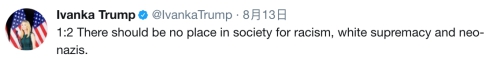特朗普的女兒伊萬卡,對此事的態(tài)度也十分鮮明。她通過社交媒體言辭激烈地譴責(zé)“種族歧視、白人至上主義和新納粹”。她表示,這些思想在美國社會沒有存在空間。