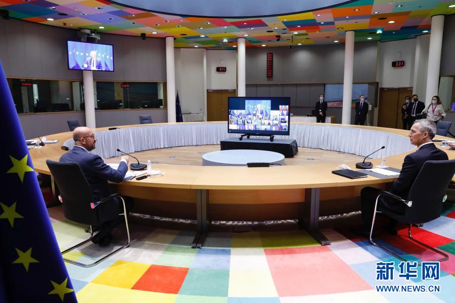 2月26日,歐洲理事會主席米歇爾(左)和北約秘書長斯托爾滕貝格在比利時(shí)布魯塞爾共同出席歐盟領(lǐng)導(dǎo)人視頻峰會第二日會議。